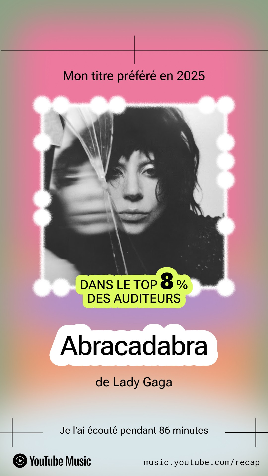 Le titre qui domine : Abracadabra. 23 écoutes. Top 8 % des auditeurs. Ce morceau a quelque chose de presque liturgique pour moi : une montée progressive, une prod ciselée, un refrain qui reste en tête pendant des heures. L’album MAYHEM (deuxième position dans mes albums préférés) a tourné en boucle — un retour aux racines pop-électro de Gaga, avec cette touche d’expérimentation qui me fait vibrer.