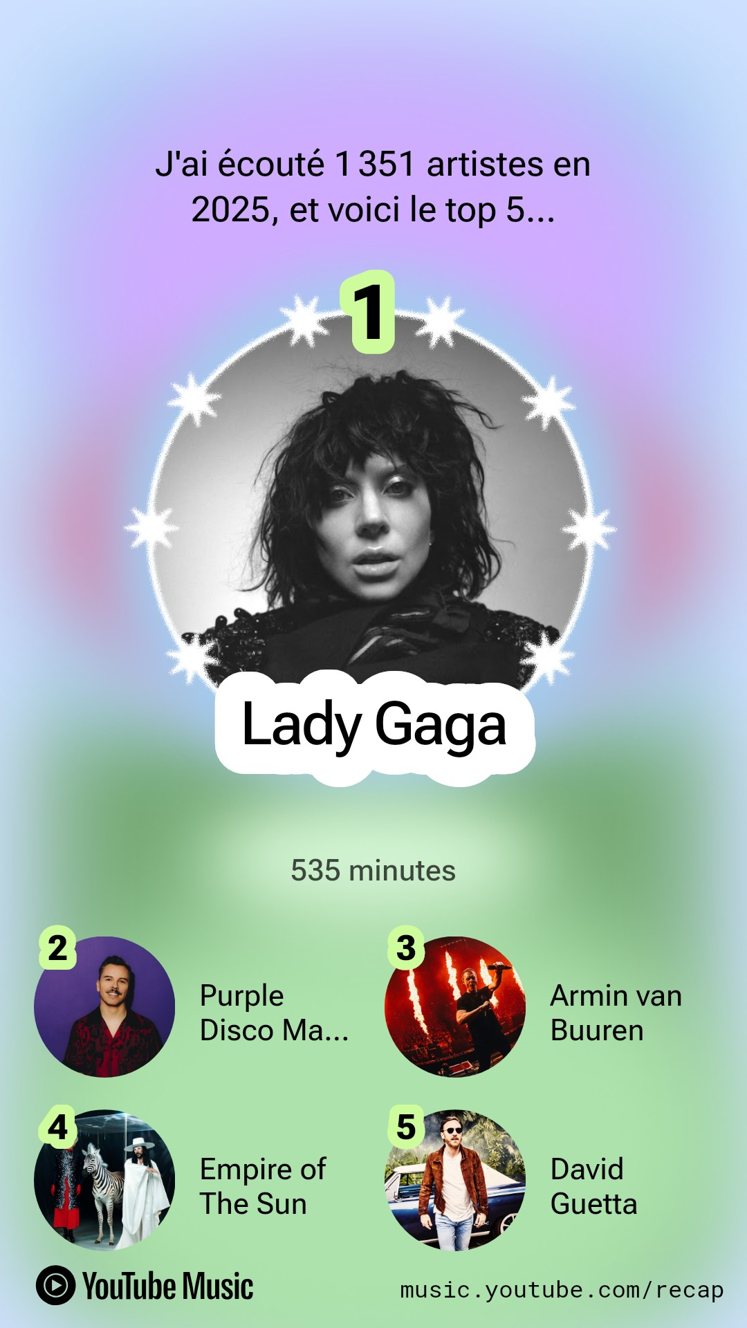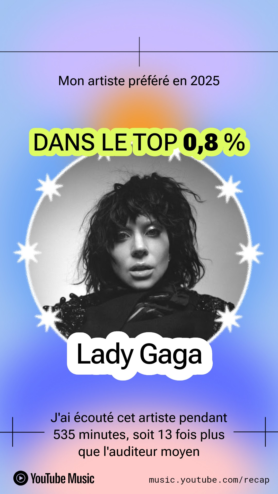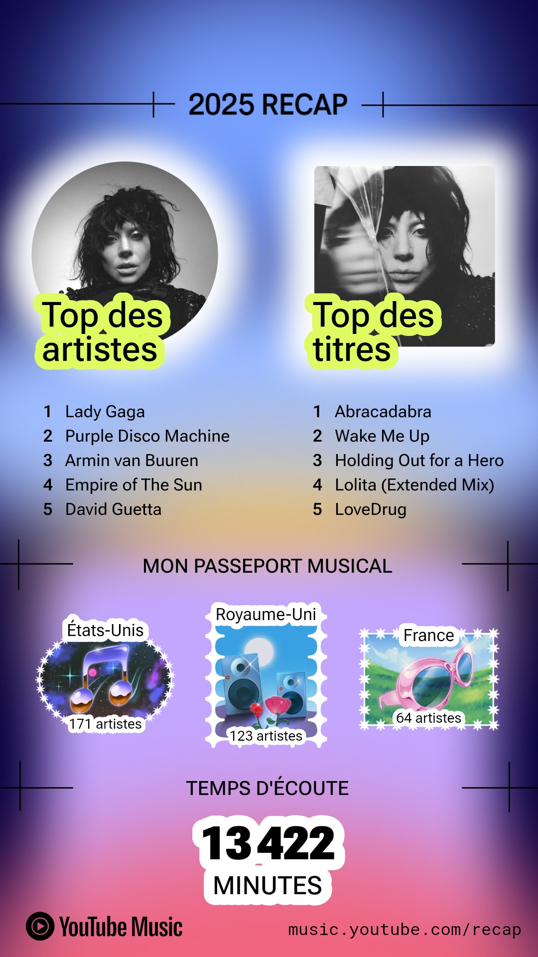 Cette année musicale, c’est un portrait en creux. L’électro comme espace de concentration. La pop comme échappatoire. Lady Gaga comme obsession récurrente — une artiste qui incarne tout ce que j’aime : l’audace, la rigueur, le spectacle, l’émotion brute.