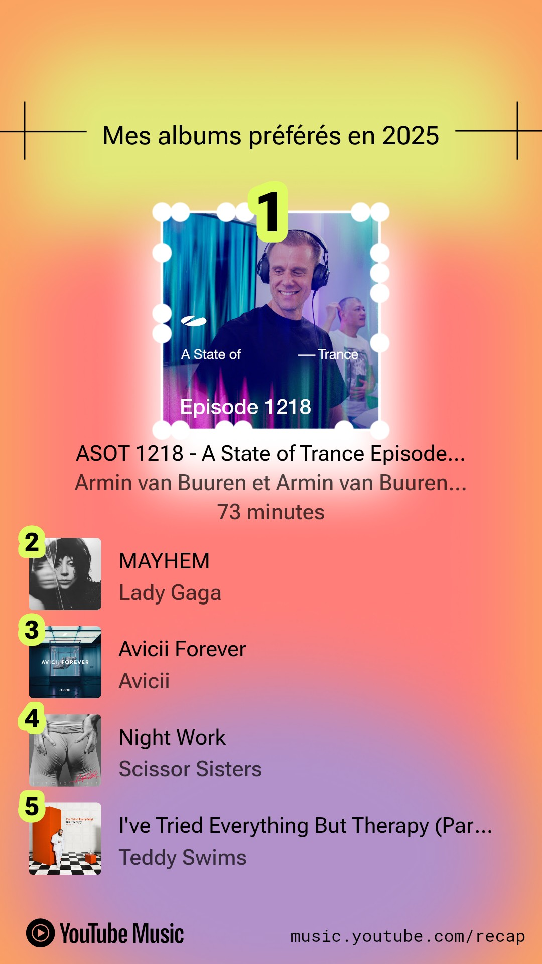 Purple Disco Machine (2ᵉ artiste) et Armin van Buuren (3ᵉ artiste) : un combo prévisible pour qui connaît mes goûts. PDM, je l’ai vu en concert cette année — une de ces soirées où la foule bouge comme un seul corps, où tout fait sens. Armin, c’est différent : c’est la grande messe de A State of Trance, ce rendez-vous annuel que je ne loupe jamais. Une liturgie électro, un rituel. L’épisode 1218 s’est d’ailleurs hissé en tête de mes albums préférés — 73 minutes de trance progressive, le genre de mix qui te met dans une bulle.