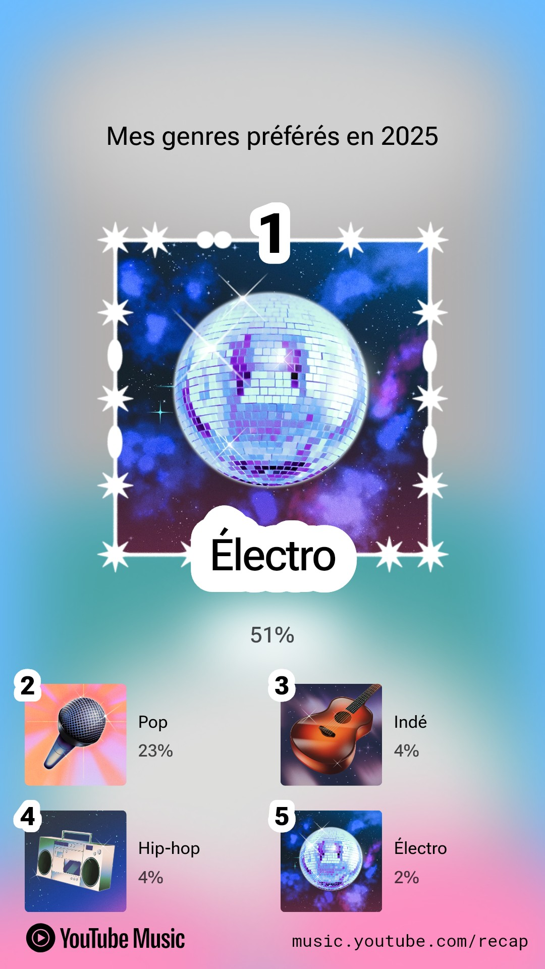 51 % électro. Sans surprise. C’est mon terrain de jeu principal — de la house mélodique à la trance en passant par la disco moderne. La musique qui me met dans le flow, qui me permet de penser, de créer, de respirer.