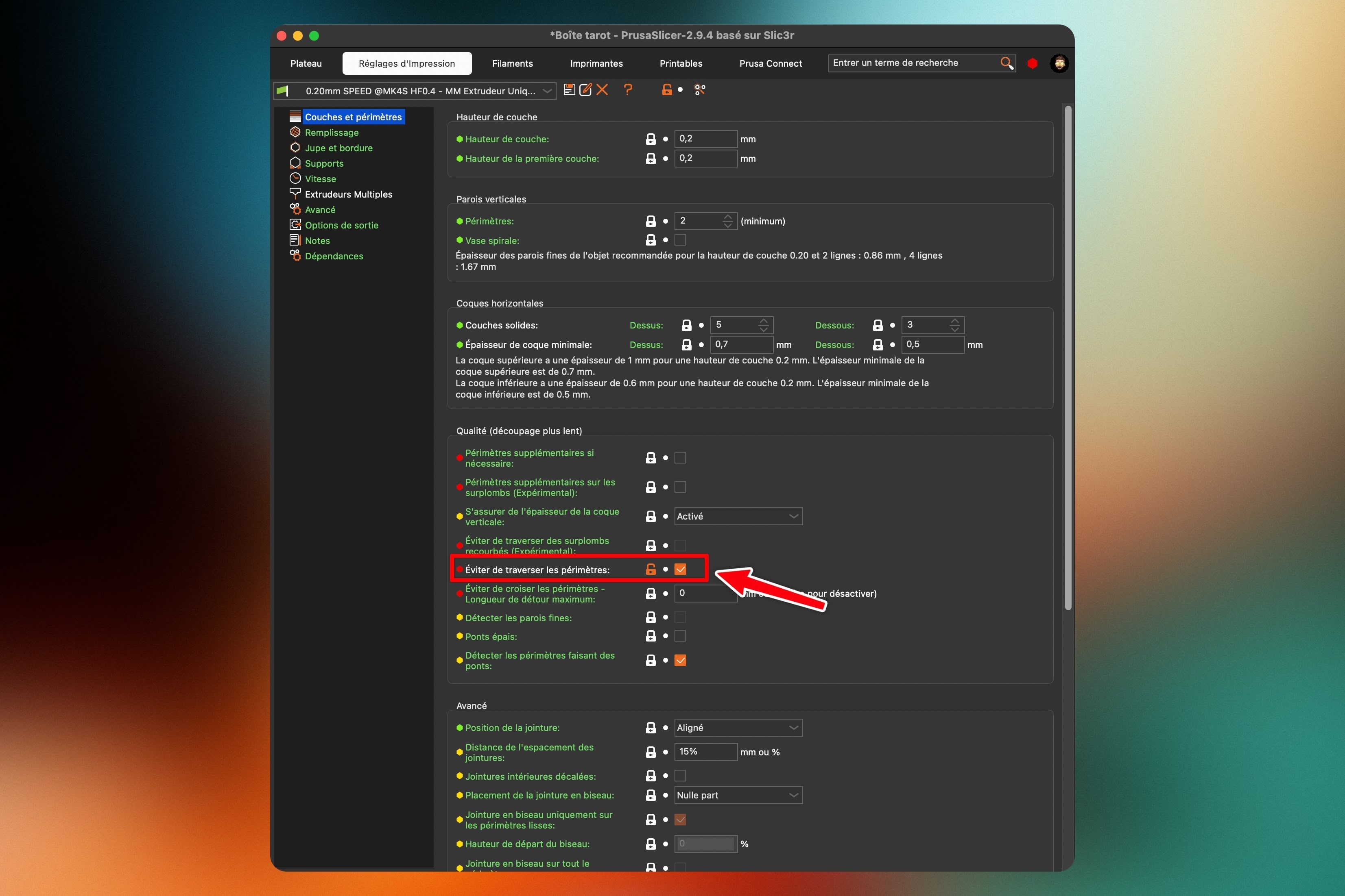 Dans l’onglet Print Settings > Layer and perimeters > Quality :