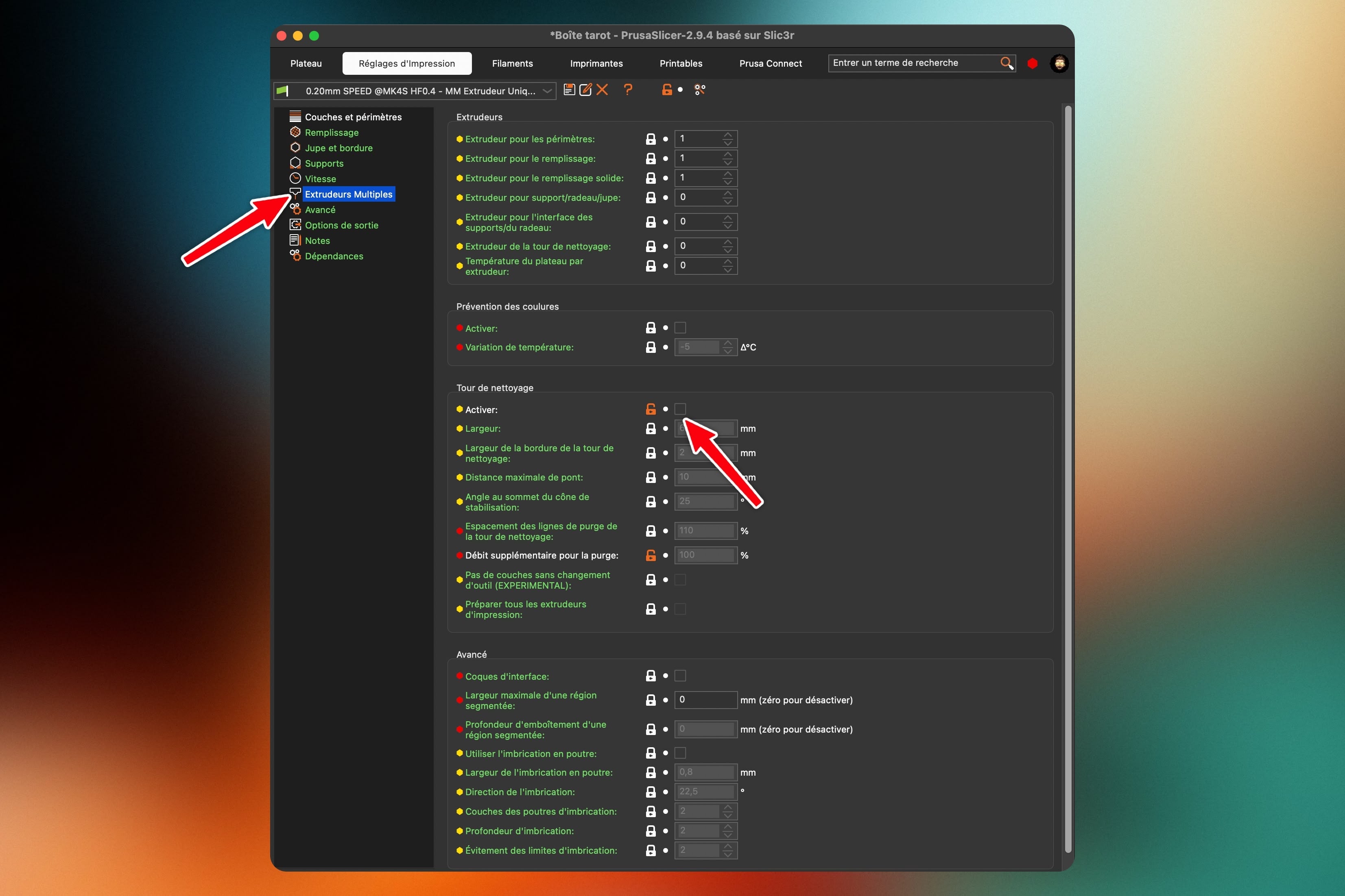 Contexte : Je configure PrusaSlicer en mode “Single Extruder Multi Material” (sans MMU), je mets deux extrudeurs virutels, je leur assigne une couleur chacun, je “peint” mes différentes pièces pour leur assigner l’extrudeur correspondant. Je vérifie que tout est bien configuré, je lance l’impression, et… rien. Aucun changement de filament. Tout sort dans la couleur déjà chargée.