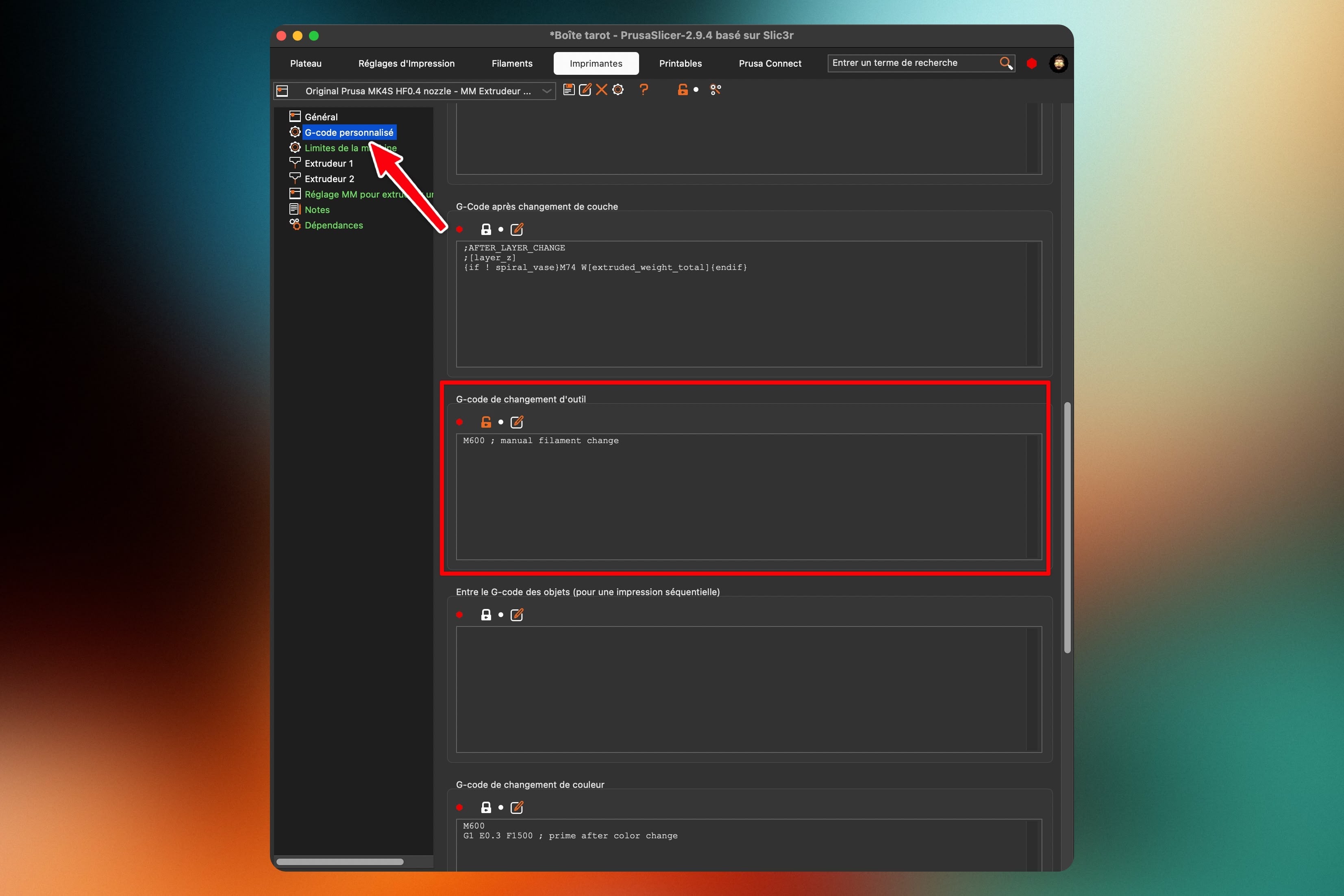 Contexte : J’ajoute un M600 dans le G-code de changement d’outil pour forcer le déchargement/chargement manuel. J’ai fait cela dans les réglages du slicer, comme ça il l’insère au bon endroit dans le G-code. Ça devrait fonctionner. Sauf que j’ai laissé la wipe tower activée, avec un flow de 200% pour accélérer la purge.