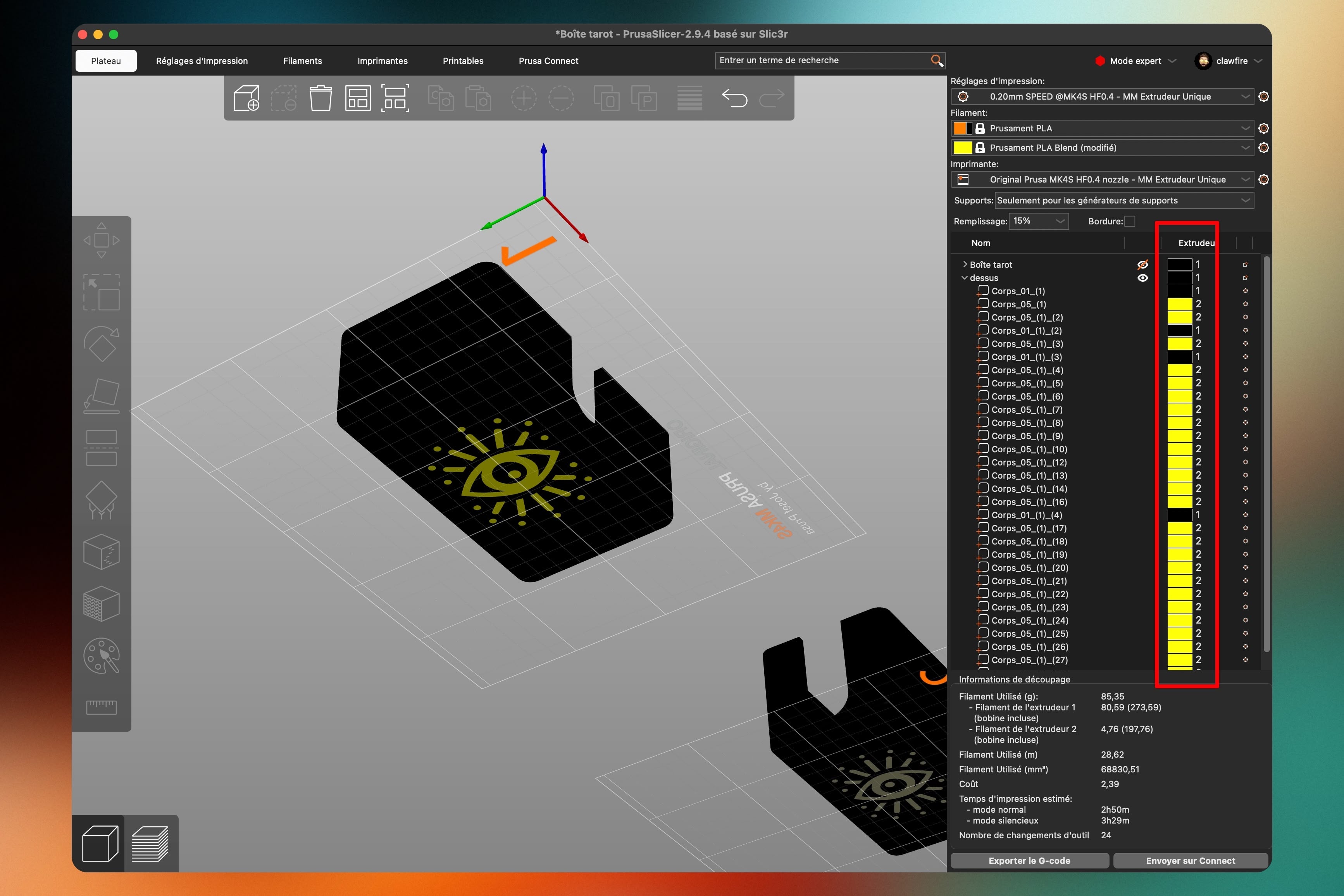 Le projet ? Une boîte de rangement pour un jeu de tarot destinée à un ami. Deux demi-boîtes, 10 couches avec deux couleurs chacune. Soit 20 changements de filament manuels au total. C’est encore jouable sans devenir fou — mais ça demande une config solide et prévisible.