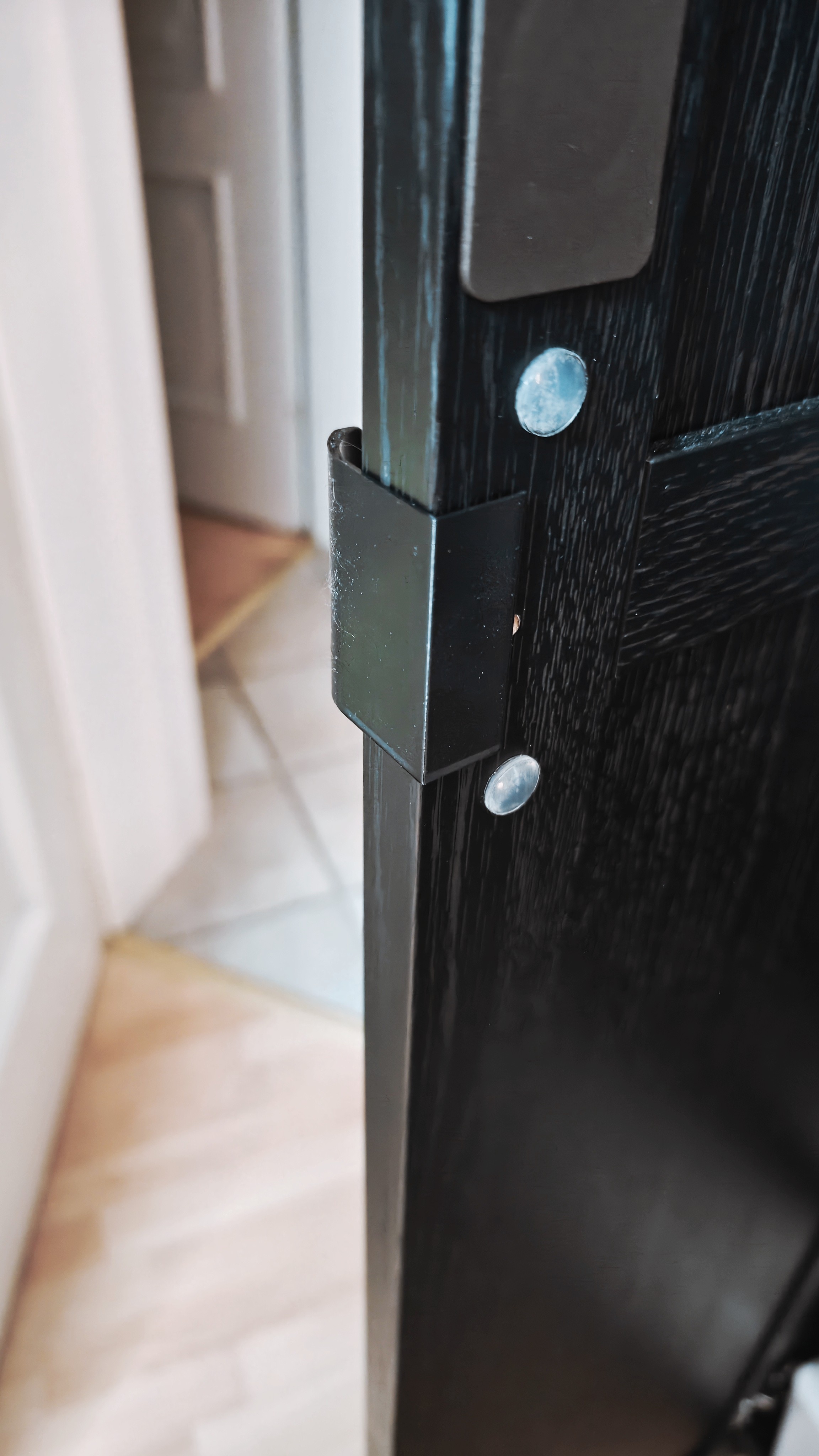 Pas de bouton qui dépasse. Pas de quincaillerie apparente. Juste un bout de plastique imprimé qui se glisse derrière le panneau de la porte et se fixe avec un adhesif 3M.